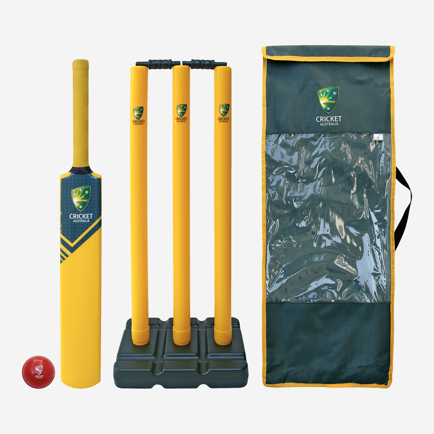Crafted from a durable plastic, this set features a bat adorned with CA branding, a set of wickets on a stand and a rubber moulded cricket ball. Set includes cricket bat, ball, stumps, bails and a compact carry bag.