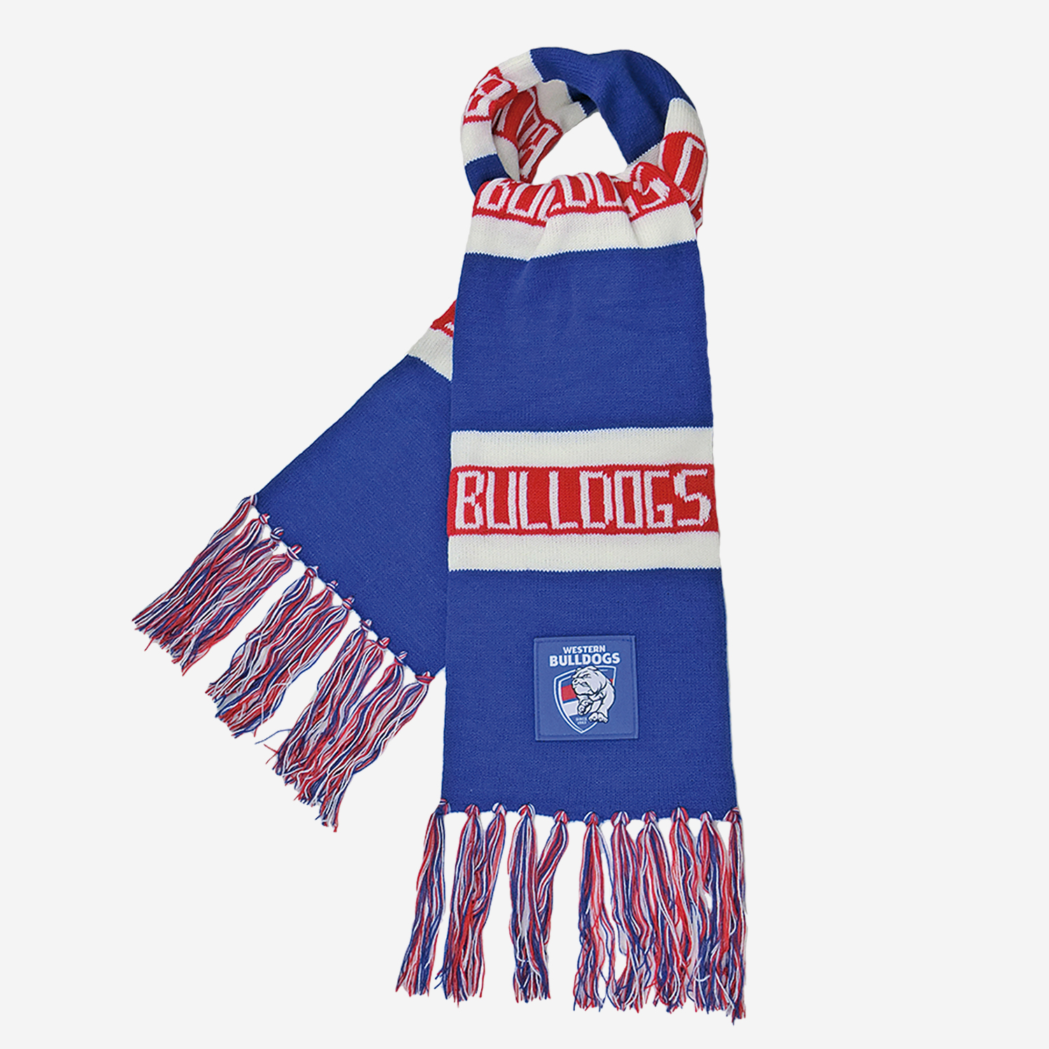 Sekem's tradtional Western Bulldogs AFL scarf, synonymous with football fans for decades! Classic bar style scarf with woven badge logo.