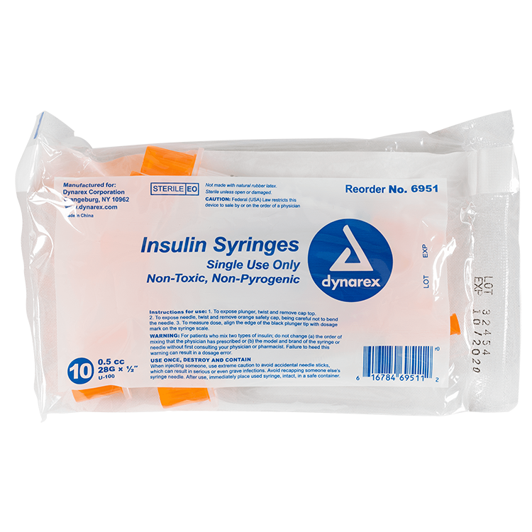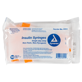 Dynarex Insulin Syringes are high-quality hypodermic syringes designed to deliver insulin effectively and precisely. Each sterile, disposable syringe is securely attached to prevent needle pop-off and features a stainless-steel needle that is coated with medical-grade lubricant and a double-beveled tip for smoother insertion. The transparent barrel is clearly marked with bold font for accurate dose measurement.