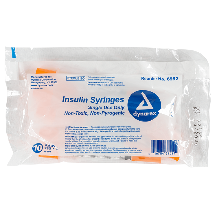 Dynarex Insulin Syringes are high-quality hypodermic syringes designed to deliver insulin effectively and precisely. Each sterile, disposable syringe is securely attached to prevent needle pop-off and features a stainless-steel needle that is coated with medical-grade lubricant and a double-beveled tip for smoother insertion. The transparent barrel is clearly marked with bold font for accurate dose measurement.