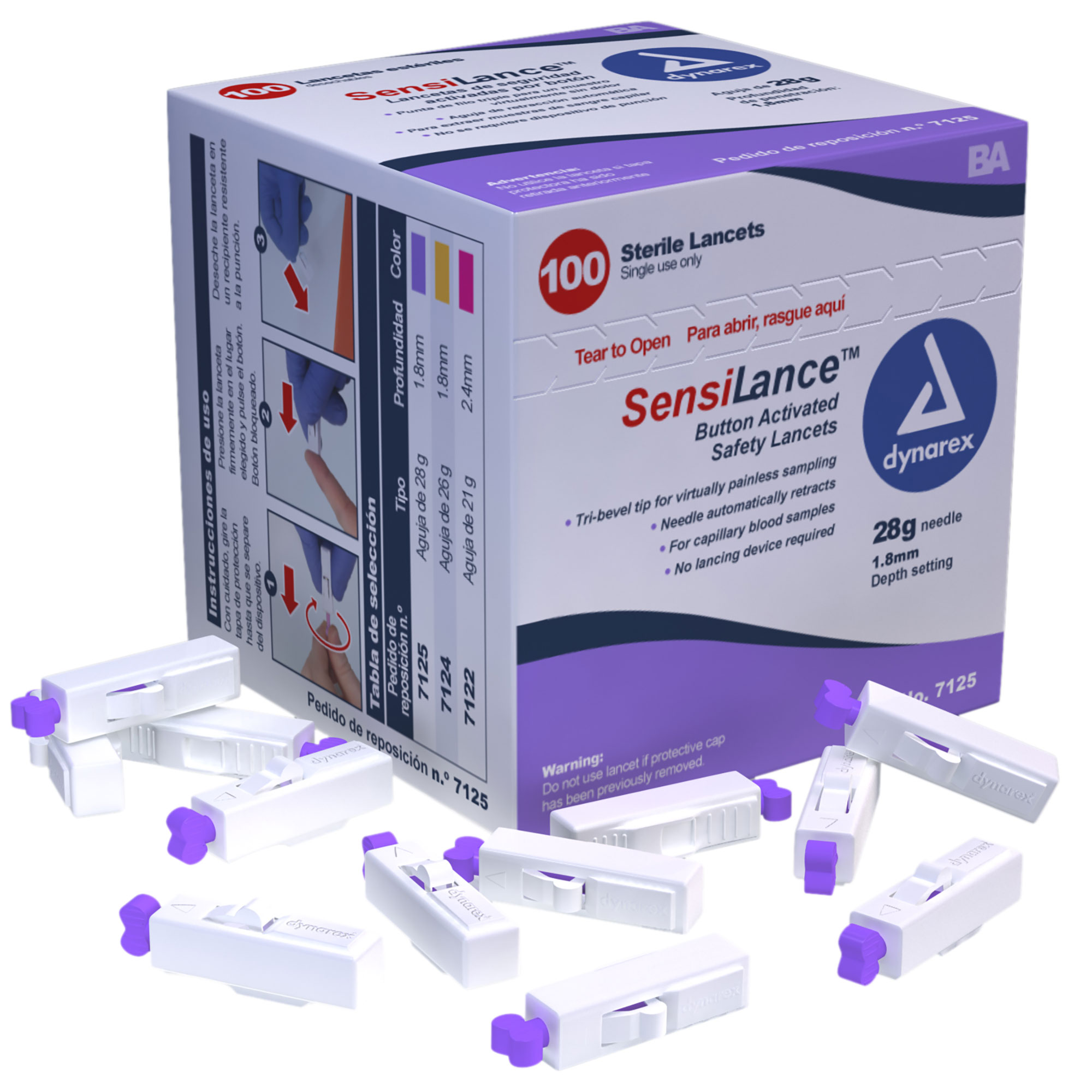 • Pressure-Activated Lancets are available in 21 Gauge- 2.2 mm. depth (7112), 26 gauge - 1.8 mm. depth (7114) and 28 gauge - 188 mm. depth (7115)