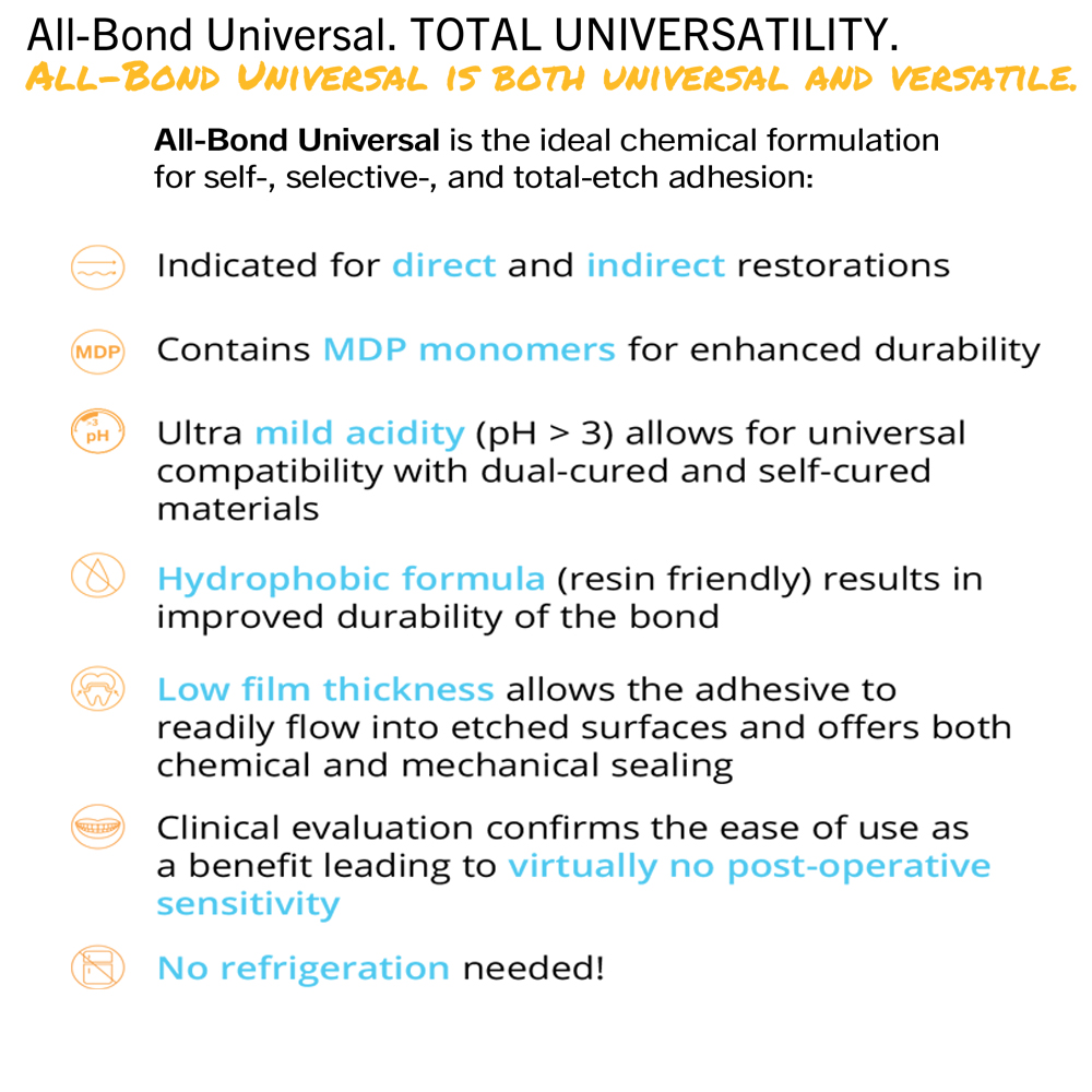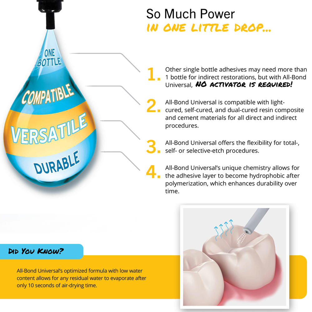 All Bond Universal is the work horse in the daily dental practice. It’s fast and easy to use single bottle standardizes every bonding procedure. Let’s face it – manufacturers offer different formulas.