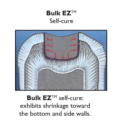 Bulk EZ is applied in 1 simple step and auto cures towards the bonded surface & towards the floor and the walls of the prep – thereby assuring no lift off or gap at the base of the prep. Finally, A Cure for Shrinkage Stress & Microleakage
