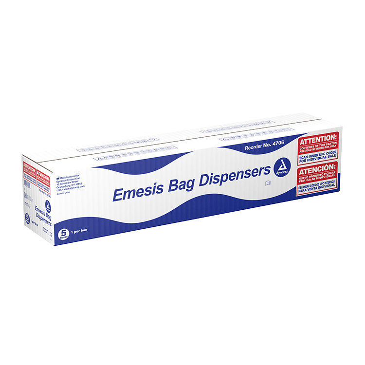 • 4706: Clear refillable dispenser holds up to 24 bags, for use with blue emesis bags (4707)