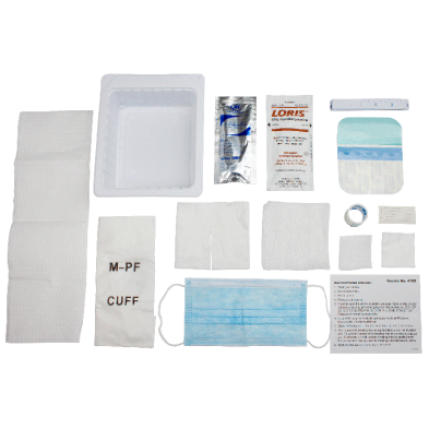 - Contents: (1)Instructions; (1)Non-Woven Face Mask; (1)Pair Vinyl Gloves with Wallet, Powder Free; (1)Polylined Drape, 13" × 18"; (1)Tape Measure, 36"; (3)Alcohol Swabsticks; (3)PVP Swabsticks; (1)Non-Woven Split Sponge, 4" × 4"; (1)Non-Adherent Sponge, 2" × 2"; (1)Gauze Sponge, 2" × 2"; (1)Gauze Sponge, 4" × 4"; (1)Roll Transparent Dressing Tape, ¾" × 18"; (1) Transparent Dressing, 4" × 4 ¾"; (1)Dressing Change Label