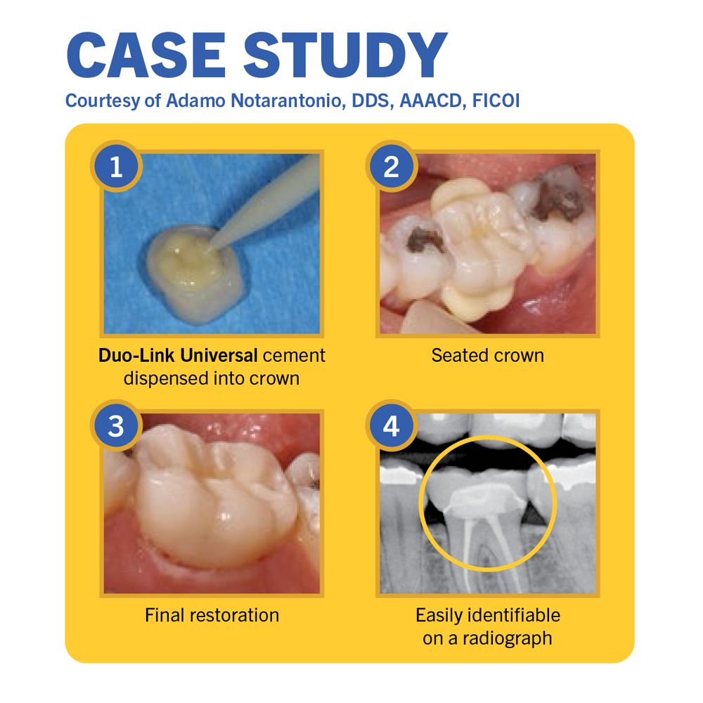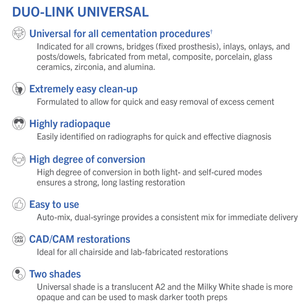 Duo-Link Universal adhesive resin cement is specially formulated for cementation of ALL* indirect restorations. It is intended for use with adhesives that are compatible with all dental materials, including all BISCO adhesives.