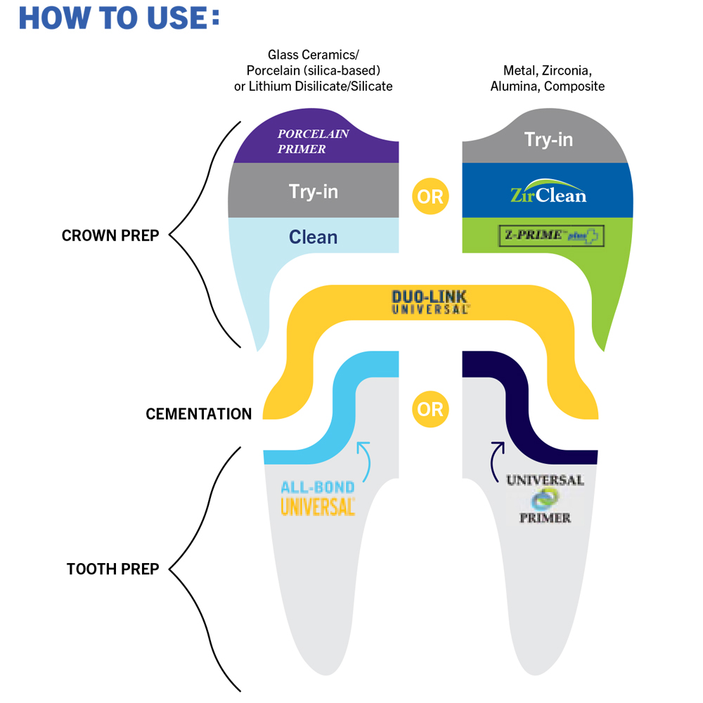 Duo-Link Universal is compatible with all dental materials, however when coupled with BISCO's adhesives, Z-Prime™ Plus and Porcelain Primer it is the ultimate product combination for all indirect restorations. The Duo-Link Universal Kits are comprehensive, easy to use, and help simplify product selection and procedures in your office.