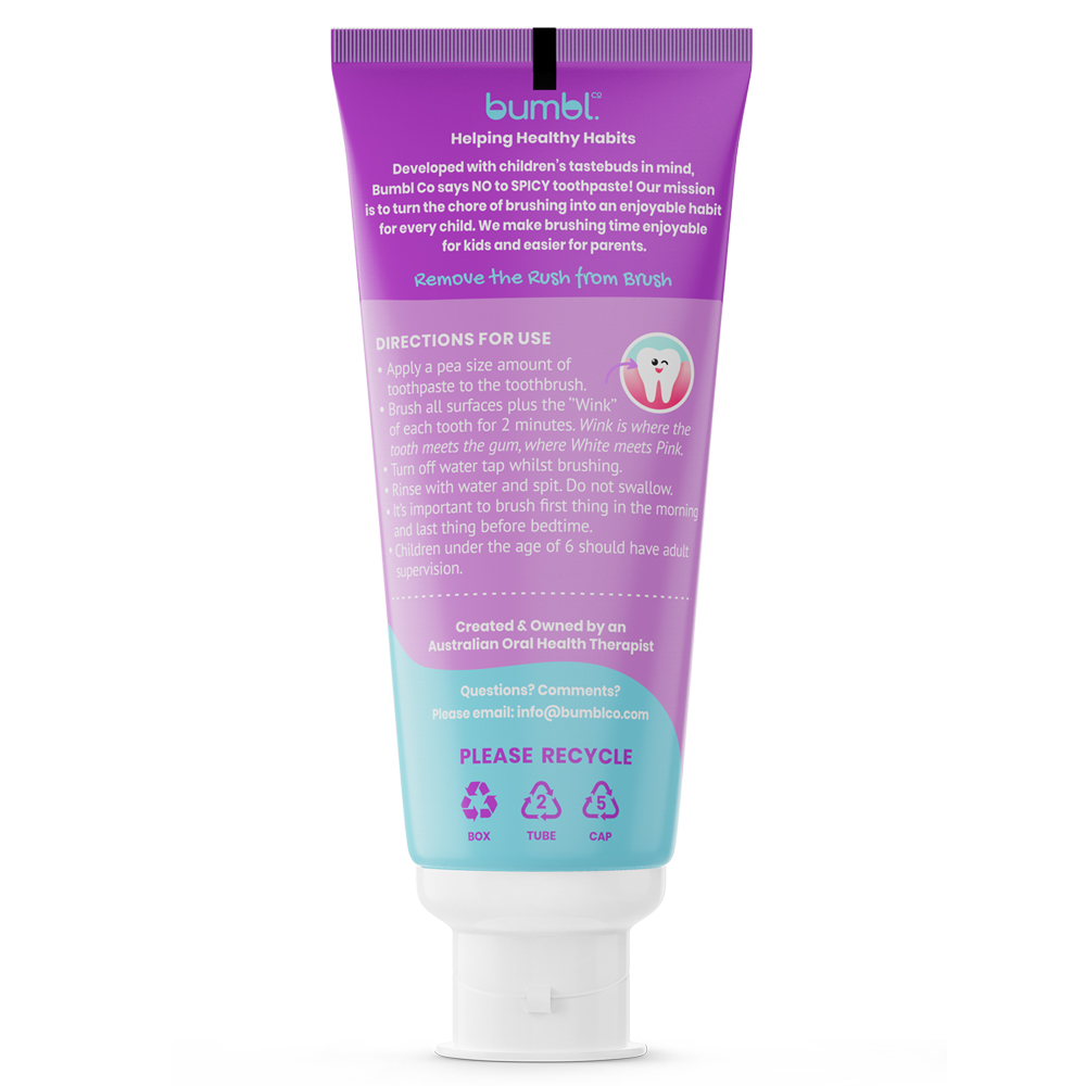 Our Bumbl Gum Kids Toothpaste offers kid-approved bubble gum flavour and colourful design, so they can have fun while giving their teeth a squeaky clean. It is carefully formulated with the highest quality ingredients to protect against caries and plaque and designed specifically for kids.