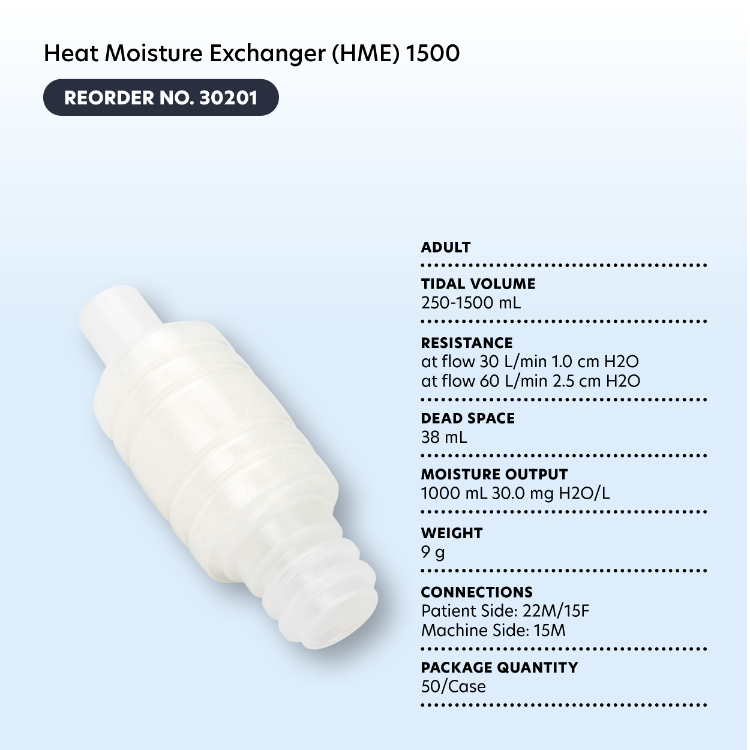 Dynarex Resp-O2 HMEs are single-use respiratory devices designed to provide humidification and help prevent mucosal dryness during mechanical patient ventilation and other respiratory treatments.