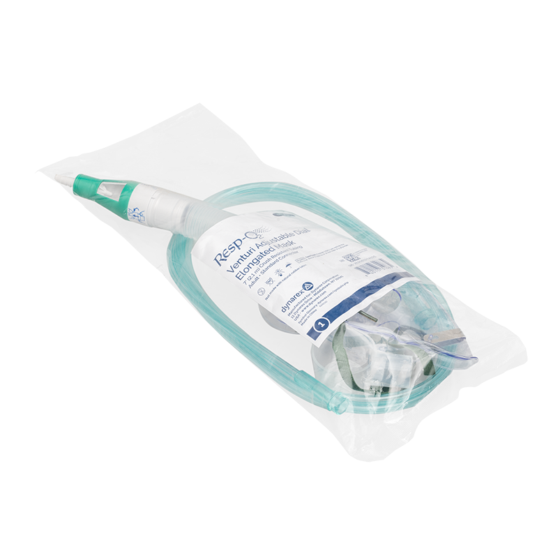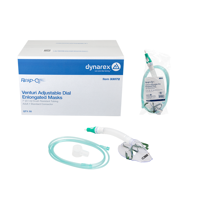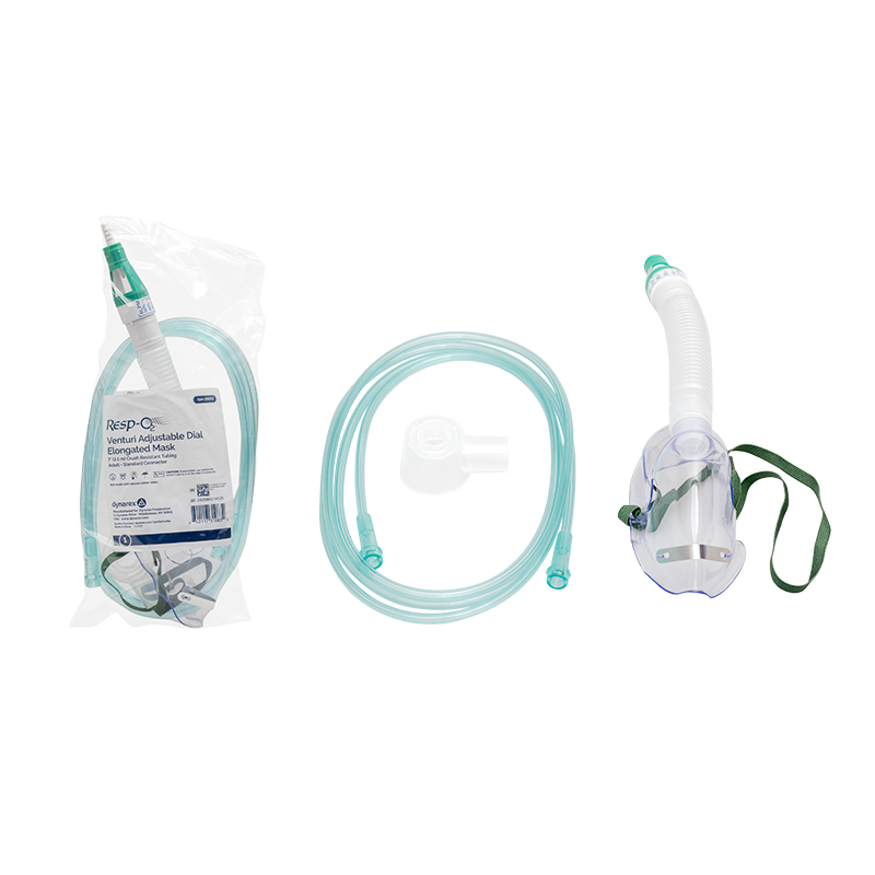 Dynarex Resp-O2 Venturi Masks are designed to deliver oxygen at fixed concentrations ranging from 24% to 50%. These masks come with light green oxygen supply tubing, designed to help improve tube visibility.