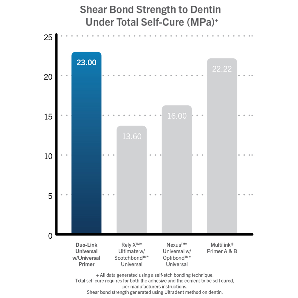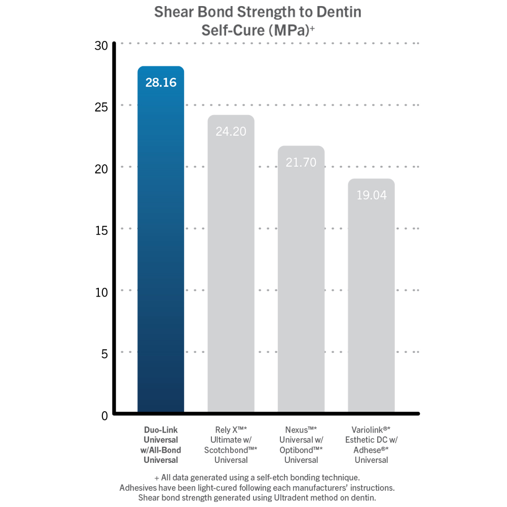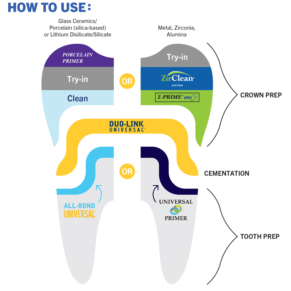 Duo-Link Universal adhesive resin cement is specially formulated for cementation of ALL* indirect restorations. It is intended for use with adhesives that are compatible with all dental materials, including all BISCO adhesives.
