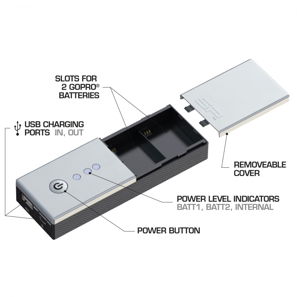 Recharge your GoPro® battery or your USB device on the go or plug the Powerbar into the wall socket to charge its own battery in addition to any two HERO3 or HERO3+ batteries plus your GoPro®’s battery. The Powerbar has enough power for charging two batteries or can power USB-chargeable devices – so you can be sure you capture all of the action.